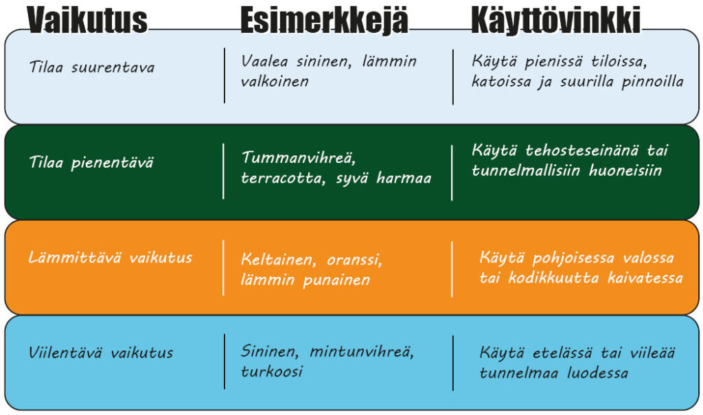 Tilaa lämmittäviä värejä ovat erilaiset punaisen sävyt, keltainen ja beige. Lämmin seinäväri saattaa saada viileän huoneen tuntumaan psykologisesti lämpimämmältä. Tilaa viilentävät värit ovat puolestaan erilaiset siniset, vihreät ja harmaat sävyt. Niillä voi luoda raikkaan, rauhalliset ja ilmavan tunnelman.